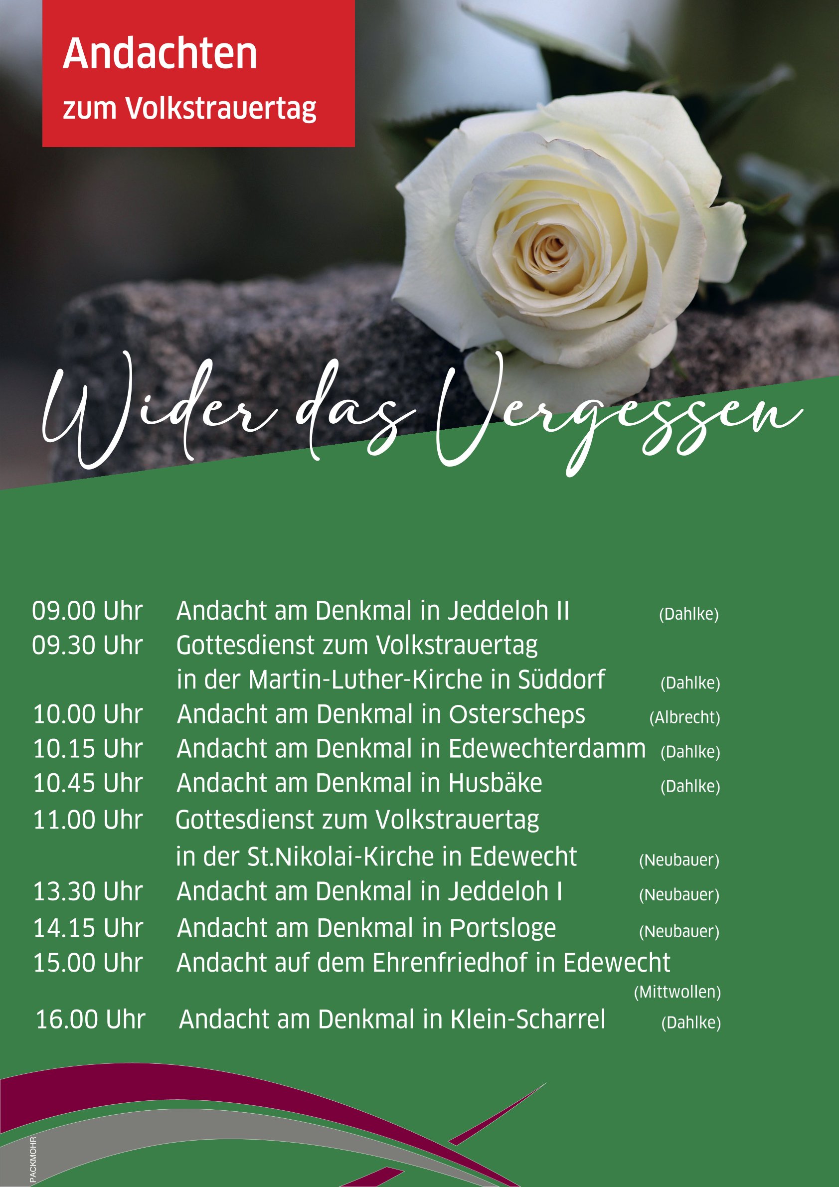 (NE) Im Jahr 2025 sind am 17. November folgende Gottesdienste und Andachten an den Ehrenmalen in den einzelnen Bauerschaften unserer Gemeinde und auf dem Ehrenfriedhof geplant: