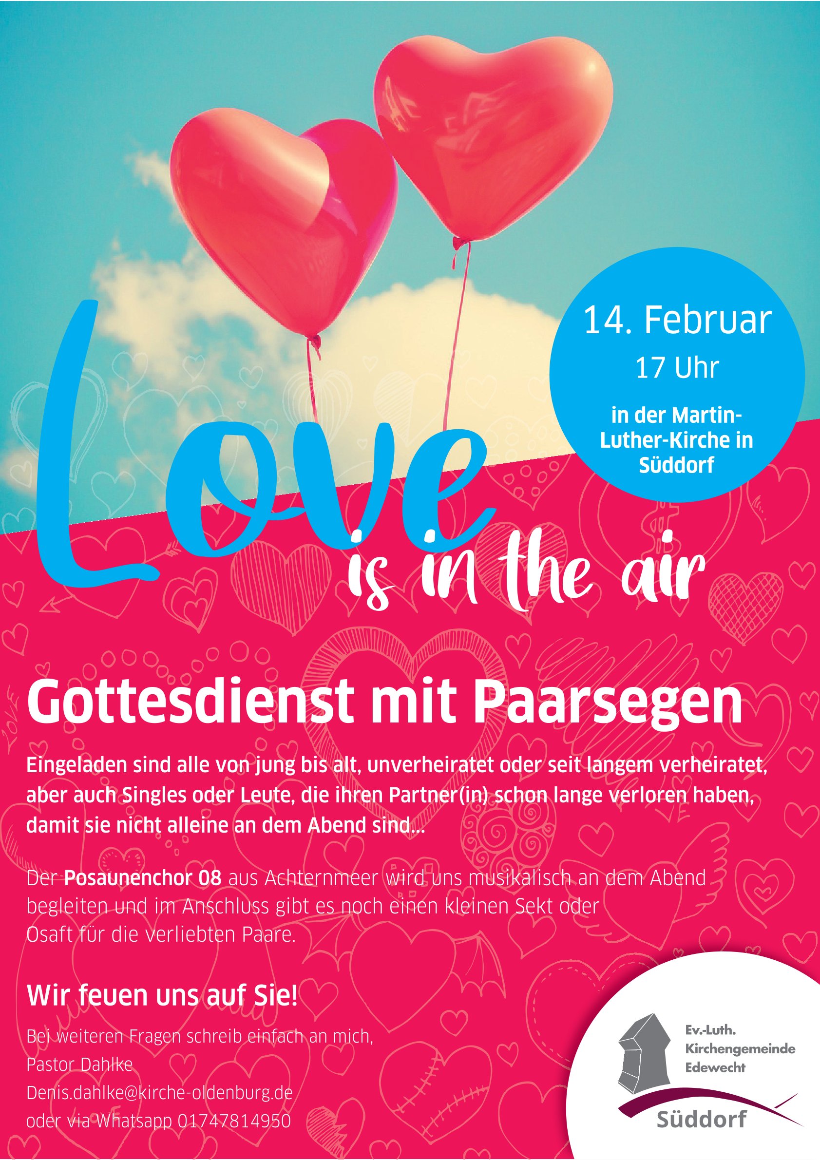 (DA) Am 14. Februar beginnt um 17.00 Uhr in der Martin-Luther-Kirche, Süddorf, der Gottesdienst, um gemeinsam zu feiern – die Liebe zwischen Paaren und die Liebe Gottes, die die ganze Welt verbinden kann.